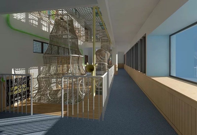 原來設(shè)計(jì)師從整體空間出發(fā),考慮到幼兒園因場(chǎng)地限制,大型玩具等玩樂設(shè)施非常有限。巧妙設(shè)置大型玩具在中庭這種看似無效的空間,不僅僅實(shí)現(xiàn)了空間的最大利用率;貫通了三層樓的走廊空間,同時(shí)擴(kuò)大幼兒活動(dòng)范圍,增加環(huán)創(chuàng)趣味性,“一舉多得”豈不妙哉~