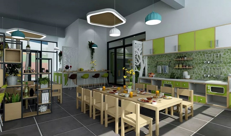 餐廳,根據(jù)幼兒園整體空間緊湊型特點(diǎn),既要滿足教職人員餐廳功能,同時(shí)也要“擔(dān)當(dāng)”幼兒廚藝課、親子活動(dòng)的廚藝室。