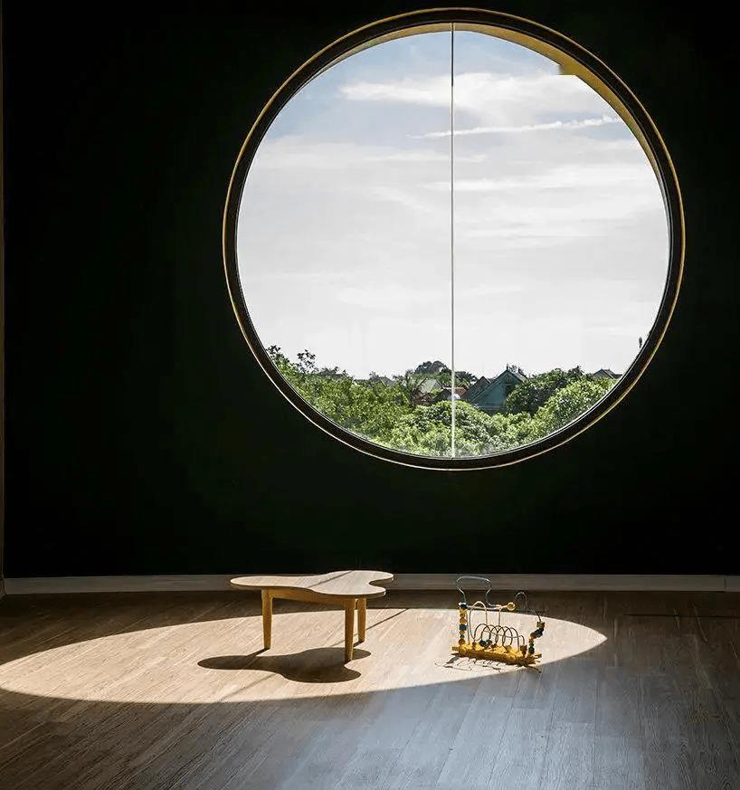 EcoKid生態(tài)幼兒園的窗戶很有趣,是一個(gè)個(gè)大小不一的圓形,小圓形安上了透明的玻璃,大圓形被墻和窗框分割,陽(yáng)光明媚的日子,這些窗戶和陽(yáng)光一起互動(dòng),在在地面形成或圓形、或橢圓、或弧形的光影。有了這些窗戶,室內(nèi)自然光線充足,空間變得輕盈通透。