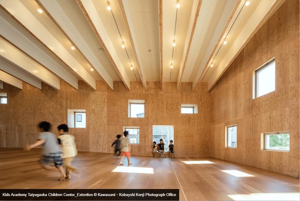 讓光線在室內(nèi)發(fā)生位移的設(shè)計(jì)手法Archivision Hirotani Studio在長(zhǎng)濱設(shè)計(jì)的保育園中也在使用,保育園里的有許多不一樣的教室,傾斜的天花板代替了水平的天花板,人們的視線順著天花板的角度延伸向上,陽(yáng)光透過不同朝向的天窗,在室內(nèi),孩子們可以感覺到光線的變化。