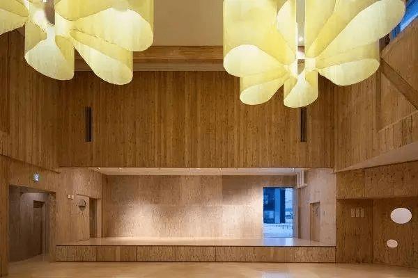 上面的做法都是基于引入自然光的需求上再變化出一些花樣,在人工照明上也可以利用材料的特性改變光。隈研吾在北海道北龍町立Yawara幼兒園大廳的燈具上使用了暖黃色的布料,它們?cè)谔旎ò迳媳粩[出花朵的形貌,散射出來的光線也因此發(fā)生了改變,暖黃色的布料也使得燈光變得更加柔和。