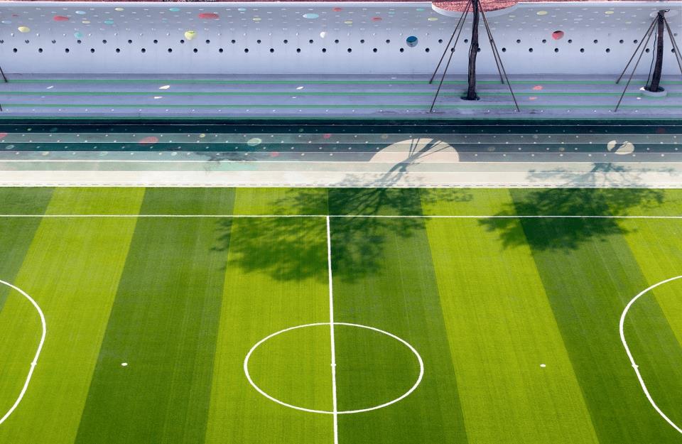 成都哈密爾頓麓湖學(xué)??磁_(tái)升起的那面弧形的頂棚嵌入了大小不一色彩各異的小園窗,隨著光線的流動(dòng),彩色的光斑會(huì)印在操場(chǎng)上,隨著太陽(yáng)的高度、方位的變化,這片色彩迷宮在操場(chǎng)上挪移,并呈現(xiàn)出不同的陰影與形態(tài)。
