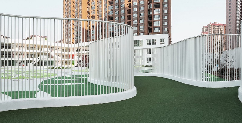 而圍墻使用的是護(hù)欄的形式而不是實(shí)體墻,通透的視野將社區(qū)和校園鏈接在一起,社區(qū)的人們可以更深入校園,被內(nèi)部?jī)和顒?dòng)時(shí)快樂的氛圍所感染,而孩子們也可以通過這樣的圍墻接觸社區(qū)內(nèi)的人,提高社交能力,也可以通過圍墻,觀察外部的環(huán)境。
